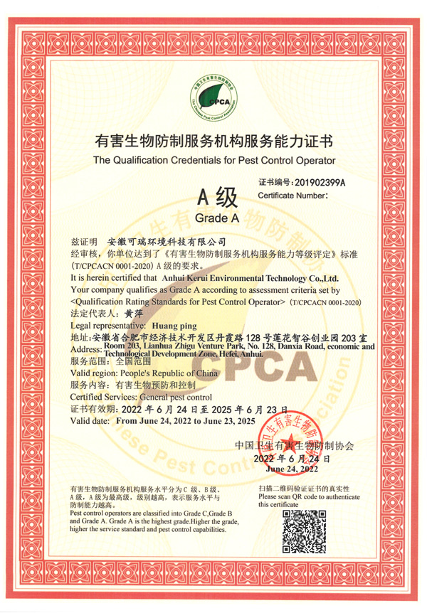 凱瑞蟲控是安徽可瑞環(huán)境科技有限公司旗下品牌,安徽可瑞環(huán)境科技有限公司成立于2014年,注冊(cè)資金500萬元,全國(guó)A級(jí)資質(zhì),致力于蟲害風(fēng)險(xiǎn)管理并提供蟲害消殺、防疫消毒、有害生物防制、蟲害控制管理與監(jiān)測(cè)、衛(wèi)生防疫消毒、商業(yè)清洗清潔服務(wù)、空氣治理服務(wù)、環(huán)境綠化施工與養(yǎng)護(hù)、藥品和器械銷售、技術(shù)咨詢與培訓(xùn)等業(yè)務(wù)的服務(wù)性公司。公司是一家有行業(yè)資質(zhì)、注冊(cè)商標(biāo)及專利的公司。我們不參與各種擾亂市場(chǎng)秩序的低價(jià)競(jìng)爭(zhēng),堅(jiān)持以合理的價(jià)格、新穎的設(shè)備、優(yōu)質(zhì)的技術(shù)、完善的質(zhì)保體系和質(zhì)保措施,來對(duì)客戶進(jìn)行綜合的服務(wù)工作。公司本著...